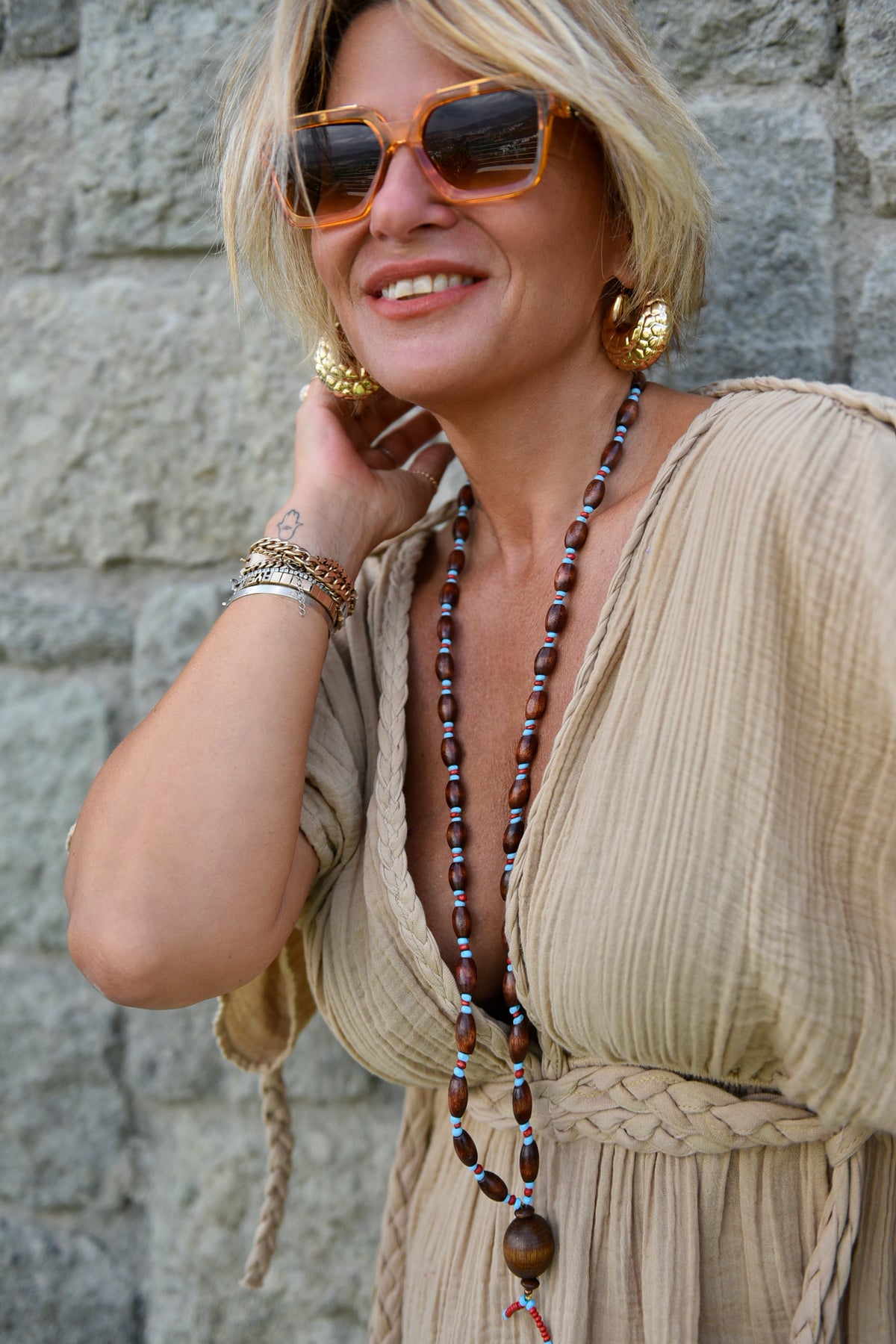 Tahta ve şeffaf camdan yapılmış kolye.  Her bir kolye tek tek, el emeği göz nuru. Bu nedenle gönderilen hiçbir kolye, birbirinin aynı değil. Ufak tefek renk farklılıkları olabilir.